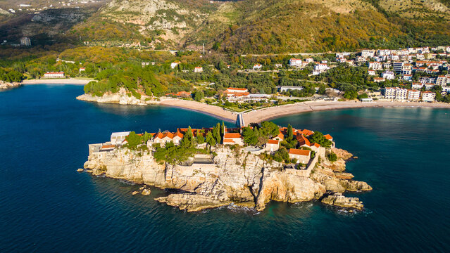 Sveti Stefan, one of Montenegro's most iconic destinations, captured from the drone, showcases its stunning beauty from above. This small islet, connected to the mainland by a narrow causeway