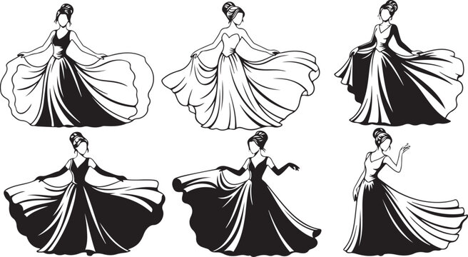 Six artistic black and white illustrations of women in flowing gowns dresses ball gowns