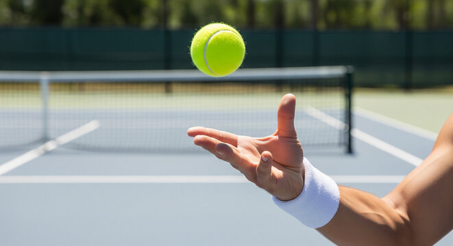 Close-up of a tennis player's hand tossing a yellow ball into the air to serve on an outdoor court