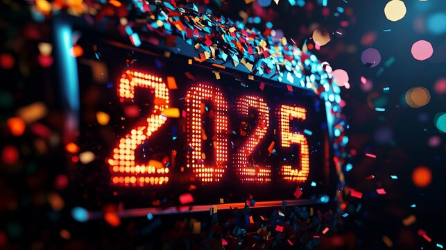 Happy New Year 2025  Countdown Clock A digital countdown clock approaching midnight, with vibrant colors and confetti ready to burst as the New Year 2025 arrives