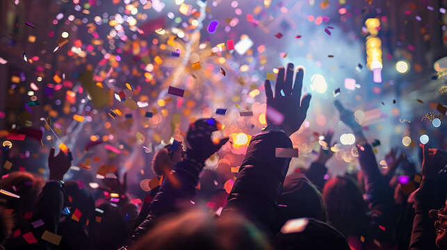People celebrating with confetti at a New Years party, capturing excitement in the air close up, party theme, dynamic, overlay, indoor backdrop