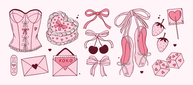 Coquette Pink Valentines day hand drawn set. Cherry, trendy bows, heart shaped cake, lollipop, love letter, envelope, ballet shoes, kawaii strawberries, corset, dice. Vector girly vintage illustration