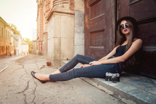 young beautiful brunette girl in a hat, sunglasses, t-shirt and jeans, with a film camera walks in the old city, holding hand hat for fear of losing it