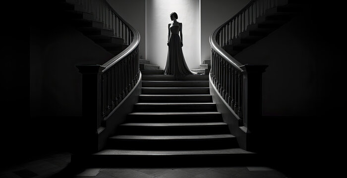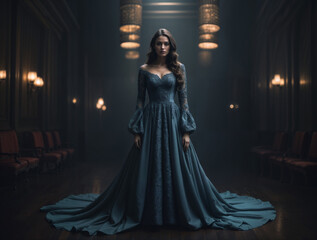 A beautiful woman in an off-shoulder teal gown stands amidst the warm candlelight of an opulent ballroom, timeless elegance and mystique. High-end fashion, fine jewelry, or romantic narratives.
