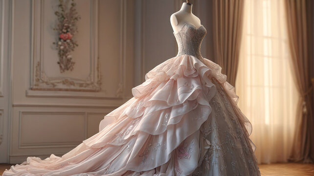 Cascading in layers of soft chiffon, the breathtaking ballgown on the mannequin captures the essence of romance and grace, Generative AI