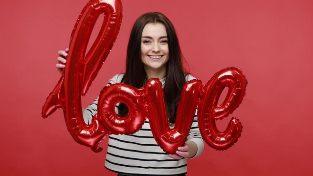 Happy woman holding love word from foil ballons, expressing romantic feelings, sending air kissing, wearing casual style long sleeve shirt. Indoor studio shot isolated on red background.