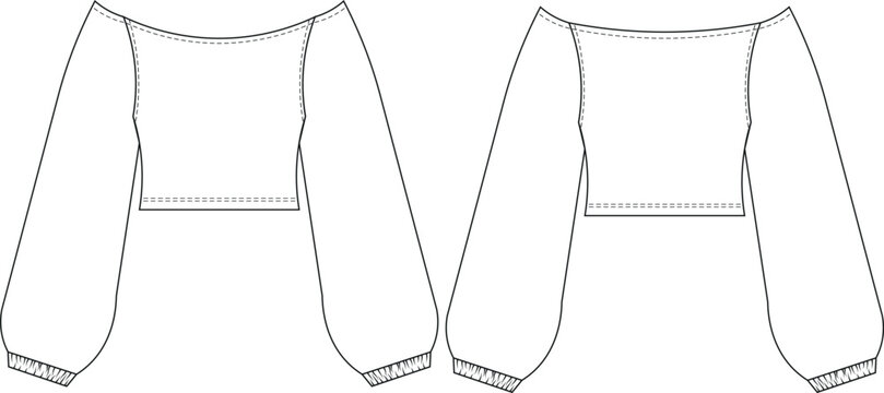 off the shoulder boat neck ballon neck long sleeve elastic banded cuff cropped crop elastic blouse top template technical drawing flat sketch cad mockup fashion woman design style model