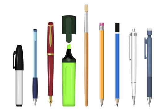Stationery set for office and school. Pen, pencil, felt-tip pen realistic vector illustration isolated on a white background