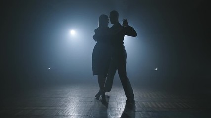 Amazing woman and handsome man doing professional movements while dancing tango in dark smoky ballroom. Steadicam shot. Silhouette of dancers in dark studio with lights. Full length shot in 4K, UHD