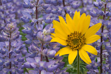 Close-up of a Balsam Root flower with Lupines