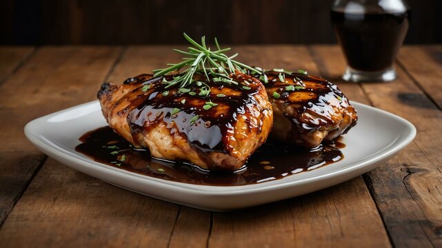stock photography sizzling balsamic glazed chicken prepared aesthetically with a background of wooden table