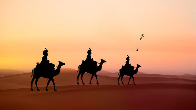 Ilustración gráfica de los Tres Reyes Magos Melchor Gaspar y Baltasar con ofrendas para el niño Jesús, bajo cielo y estrellas, escena tradicion de la noche de reyes y la Navidad con espacio para texto