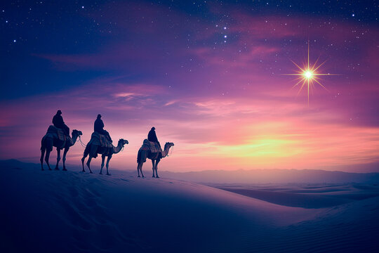 The Three wise men from the Bible travelling and following a bright star, Christmas nativity, 3 kings day holiday
