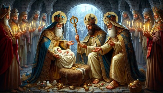 Three Kings' Journey: In a symbolic representation, three regal kings are depicted, each adorned in majestic attire and bearing symbolic gifts. Their expressions evoke reverence.