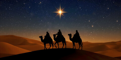 Three wise men riding camel following a star in the desert at night. Silhouette of the three wise men traveling on camels to Bethlehem for the birth of baby Jesus, offering symbolic gifts.