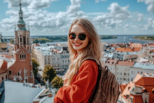 A young, attractive, and cheerful girl traveler admires the old town of Riga, Latvia, from the viewing platform, traveling through the Baltic countries