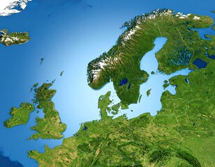 Detailed satellite view of Scandinavia and the British Isles from a high altitude