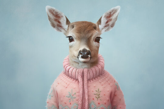 Adorable Bambi: Portrait of a Young Deer in a Pink Sweater on a Blue Background. AI generated.