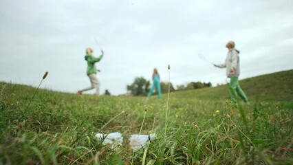 A family plays tennis on a walk in the park. An older woman plays bambinton with a girl and a child. Happy together . Active recreation and family love and happiness. High quality 4k footage