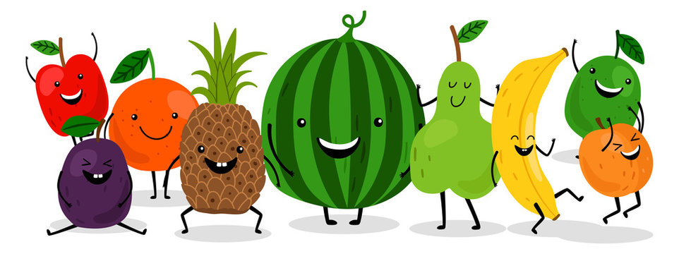 Vector illustration of cute banana cartoon character isolated on white background. Fruit cartoon set with kawaii smiling emoji.
