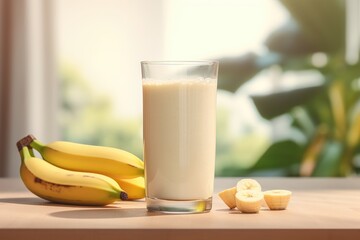 A creamy peanut butter banana smoothie in a clear glass, garnished with banana slices, in a health-focused setting with empty space for text