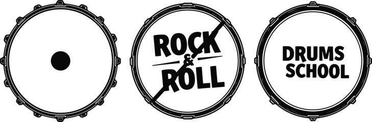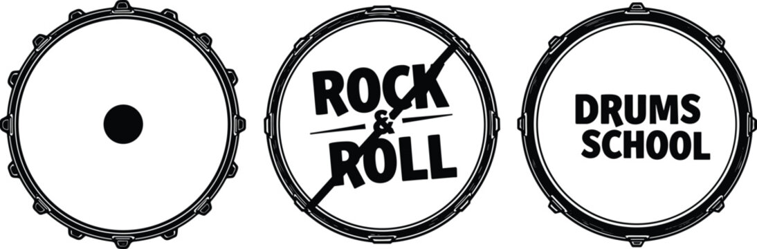 Rock and roll drum set illustration, percussion music concept, drum head vector design, music education, band rehearsal, drummer logo template