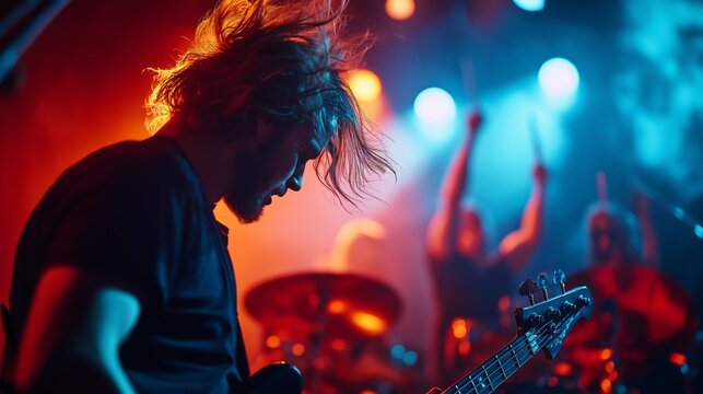 Bass guitarist performing onstage, rocking energetic music under colorful stage lights with band members, generating dynamic concert atmosphere