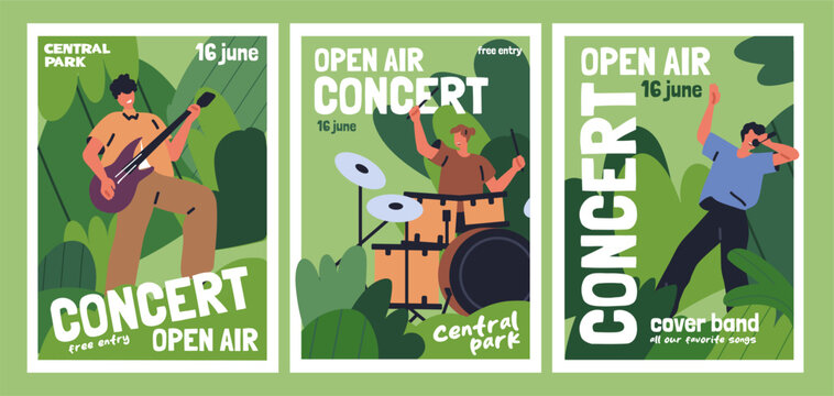 Open-air festival, outdoor concert, invitation posters set. Summer fest in nature, music band in park, promotion advertising inviting cards, promo placards, flyers designs. Flat vector illustrations
