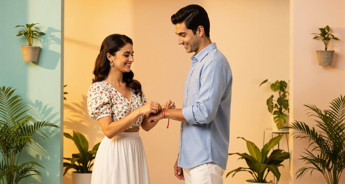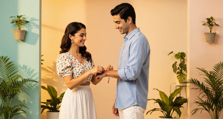 Sister tying rakhi on her brother's wrist on the occasion of Raksha Bandhan