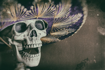 Mexican Bandit Skeleton . A skeleton wearing a Mexican sombrero and a poncho. Edited in a vintage film style.