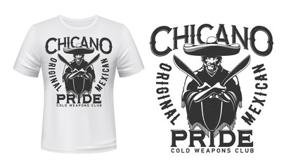 Mexican bandit with knives t-shirt print mockup of bladed weapon or cold arms vector design. Mexican gangster with machetes, sombrero and poncho, custom apparel print template for melee weapon club