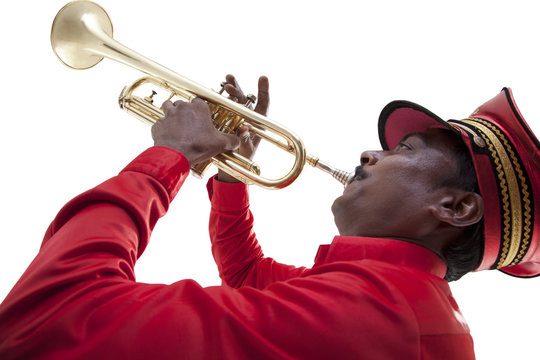 Closeup of military musicians in green uniform and white gloves playing a French horn during a parade in the street.