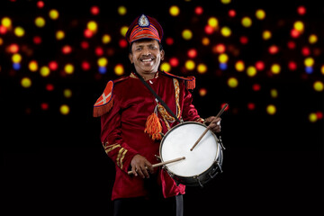 Saint nick bandmaster chief in costume accompany professional orchestra as choir musician, standing over greenscreen. Santa claus with gifts bag playing band music, musical conductor.