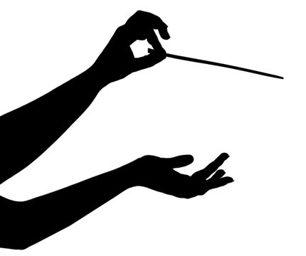 Orchestra conductor's hands holding the baton, leading with precision and passion against dark theater background with a blurred audience