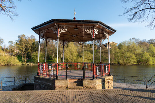 Victorian bandstand in Roundhay public park Leeds Yorkshire England with Waterloo Lake behind.