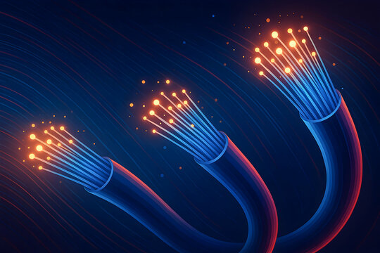 A vibrant illustration of fiber optic cables transmitting light signals, symbolizing high-speed internet technology and connectivity in the digital age.