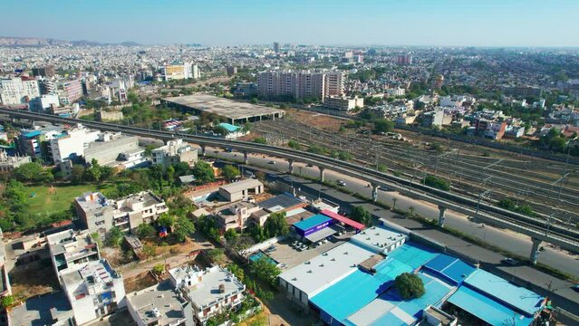 locked aerial elevated shot showing busy street and elevated metro train track and railway yard and the colorful tin tops of businesses