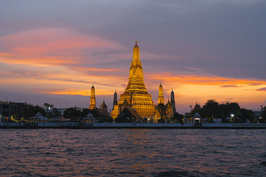 Wat Arun panorama view at sunset, A Buddhist temple in Bangkok, Thailand, Wat Arun is one of the most well known of Thailand's landmarks