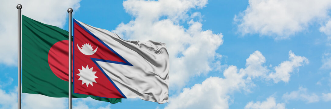 Bangladesh and Nepal flag waving in the wind against white cloudy blue sky together. Diplomacy concept, international relations.