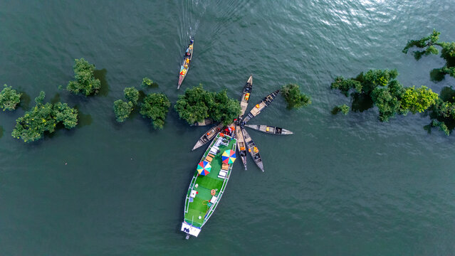 Areal view landscape  of Tanguar Haor, Sunamganj, Bangladesh. Traditional boats with a houseboat at the Tanguar Haor in Sunamganj, a famous tourist spot in Bangladesh
