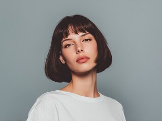 Portrait of woman with blunt bob haircut and bangs on solid background in studio lighting for beauty shot.