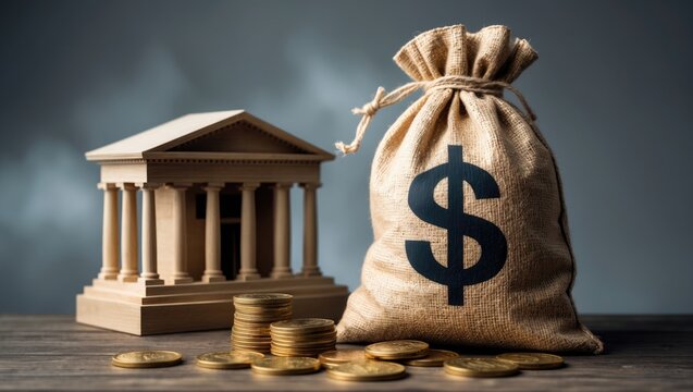 Dollar money bag and government bank building. Budgeting and tax collection. State debt. GDP and GNP. Placing deposits and lending loans. Monetary policy. Supporting businesses during crises.