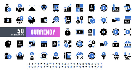 Vector of 50 Currency FInancial Balck and Blue Solid Glyph Icon Set. 48x48 Pixel Perfect..