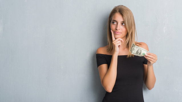Beautiful young woman over grunge grey wall holding a dollar serious face thinking about question, very confused idea