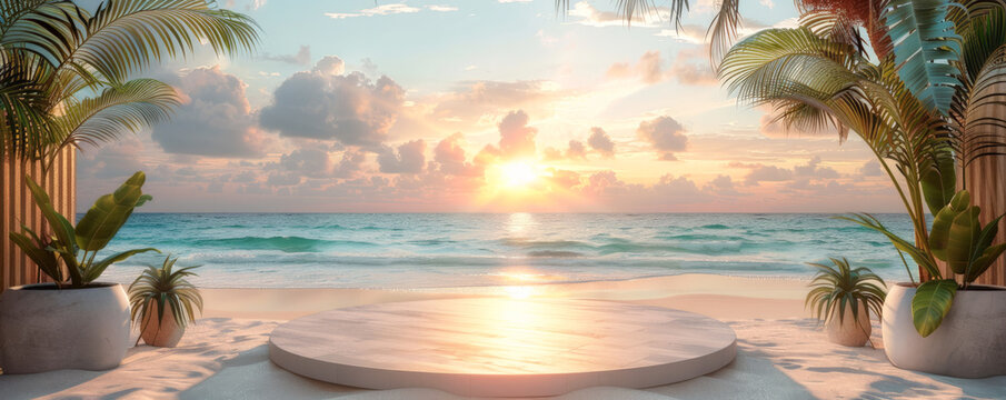 Tropical beach paradise with empty pedestal for product display under palm trees
