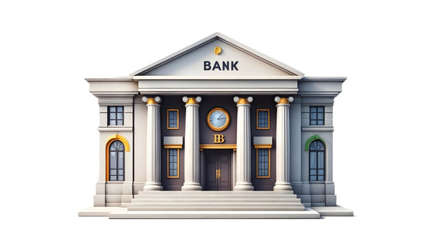 Stylized illustration of a grand bank building facade with classical ionic columns and a prominent sign.