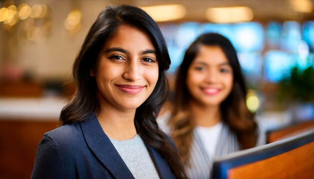 Blurred bokeh effect in a busy banking hall with teller windows and customer interactions.