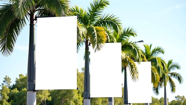 Blank vertical advertising banners on street lamp posts against lush green palm trees. A mockup