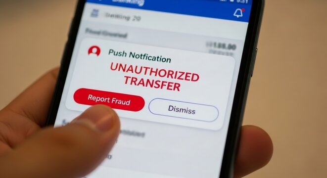Man taps “Report fraud” on phone screen after receiving unauthorized transfer notification. Digital banking security issue concept.