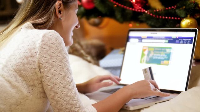 Closeup 4k footage of young woman holding credit card in hand and shopping online to order gifts and presents for Christmas. Concept shot of online shopping and e-commerce.